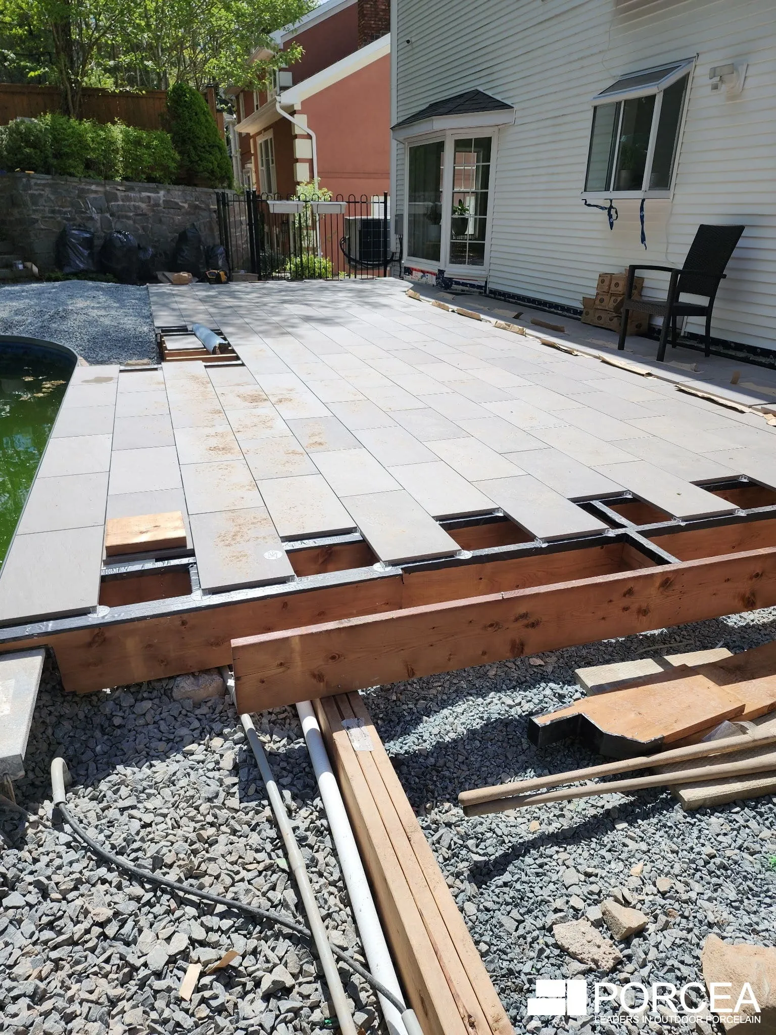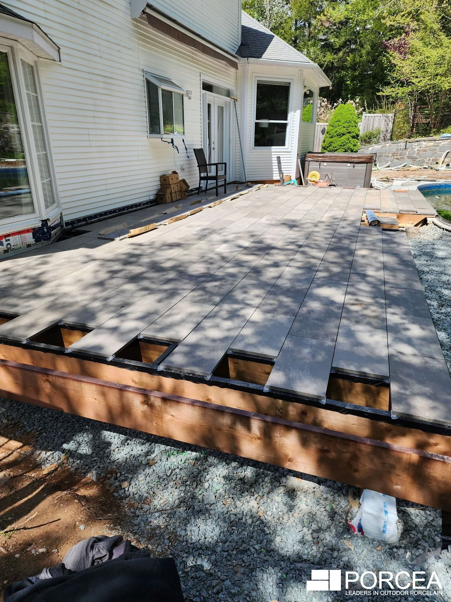 Porcea Slate Grey is readily available as pavers in our stock inventory, and you can always complement this product with natural stone copings and steps in Slate Grey colour to match.
